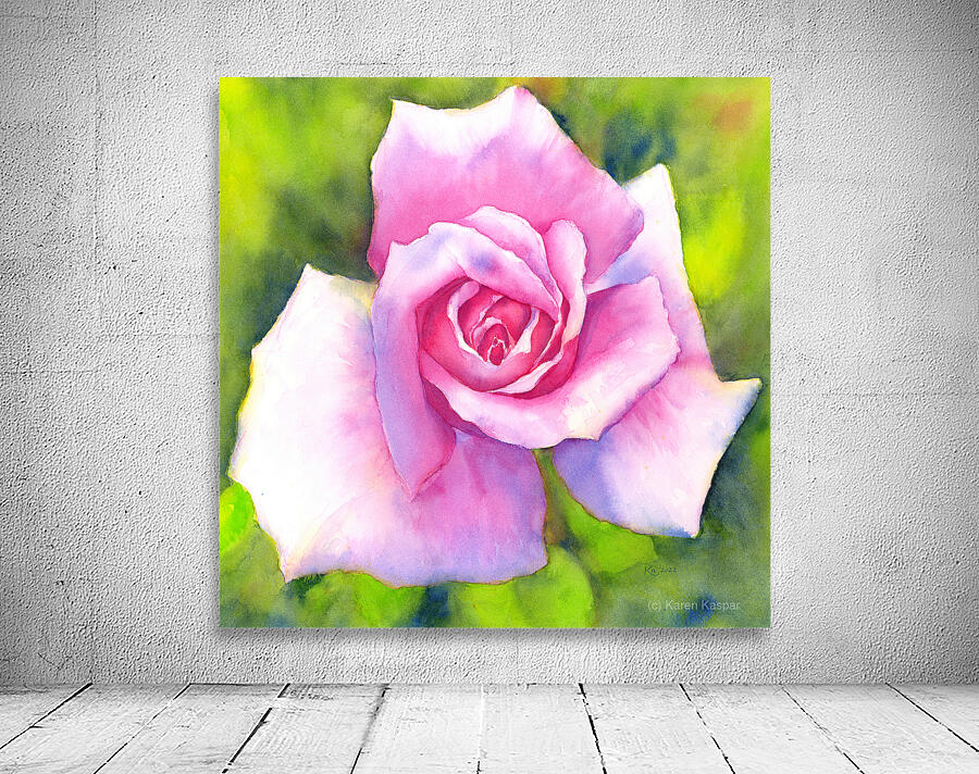 New Years Rose is a watercolor painting in contemporary square format by artist Karen Kaspar. It shows a delicate Rose blossom in shades of pink, white and blue on an abstracted green background with leaves. I started the New Year 2022 with painting a watercolor portrait of a beautiful Rose blossom with delicate petals in vibrant shades of pink, white and blue. Who can resist the beauty of a rose? It delights the heart of flower and garden lovers. Fine art prints and home decor from original artwork, paintings and photography by artist Karen Kaspar. 230