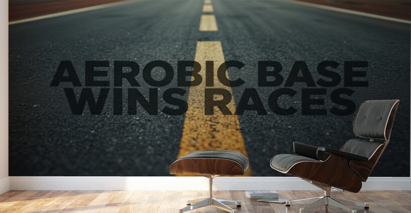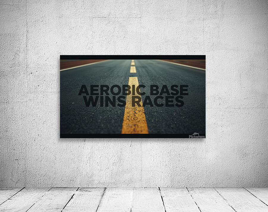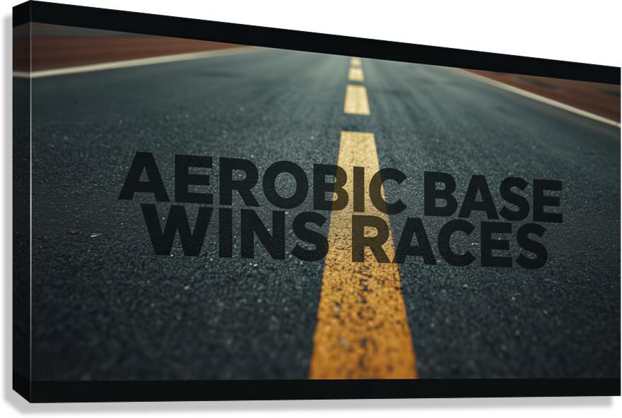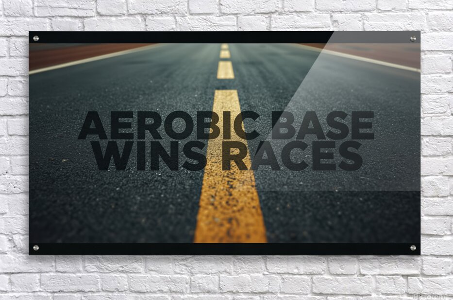 A bold mantra—“Aerobic Base Wins Races”—set over a road’s centerline, capturing the essence of endurance coaching: patient base miles create...[+]