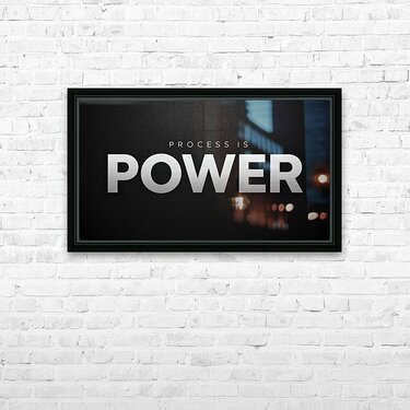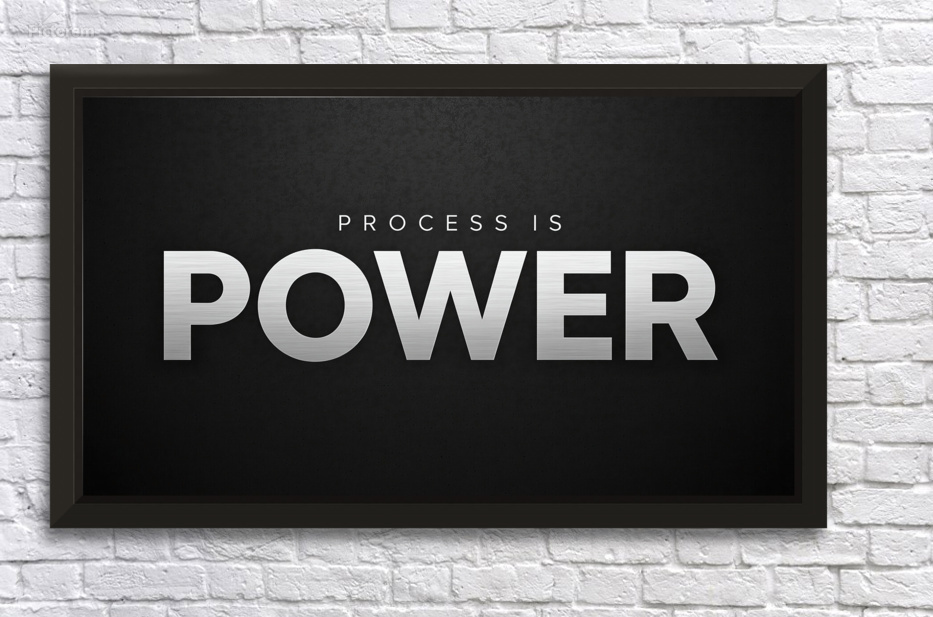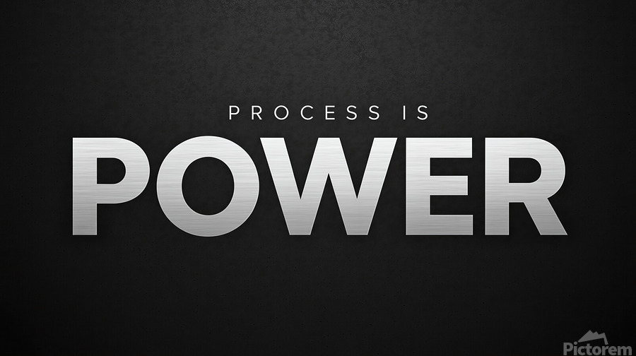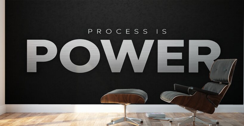 A sleek, minimalist motivational design featuring the bold phrase “PROCESS IS POWER” in metallic brushed silver on a dark textured background. The image embodies discipline, endurance, and mastery through repetition—perfect for gym walls, training spaces, or work environments that celebrate the grind and reward consistency. The modern typography and high-contrast finish evoke strength and focus.