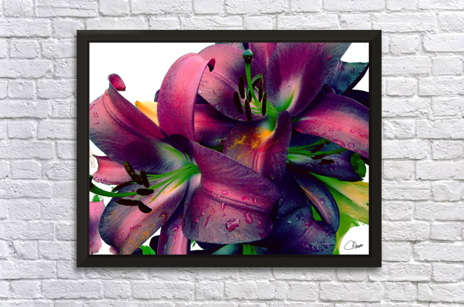 I originally took a close up shot of Lily flowers and laterally digitally manipulated using a variety of modalities (including using the Magic Background Remover in canva.com) these into deep rich tones on a white background. They are just stunning flowers.