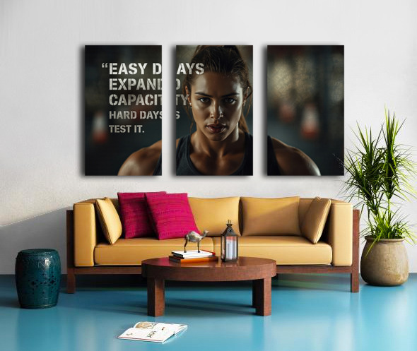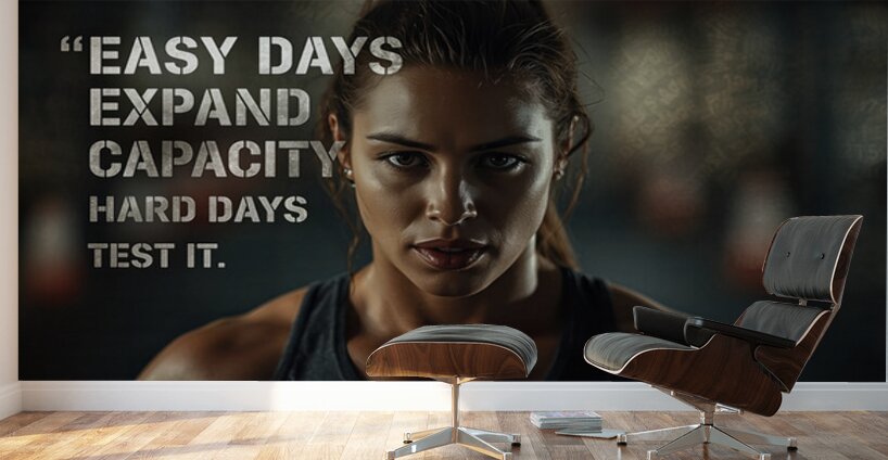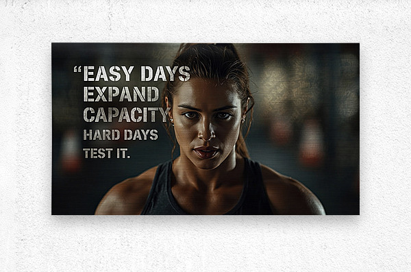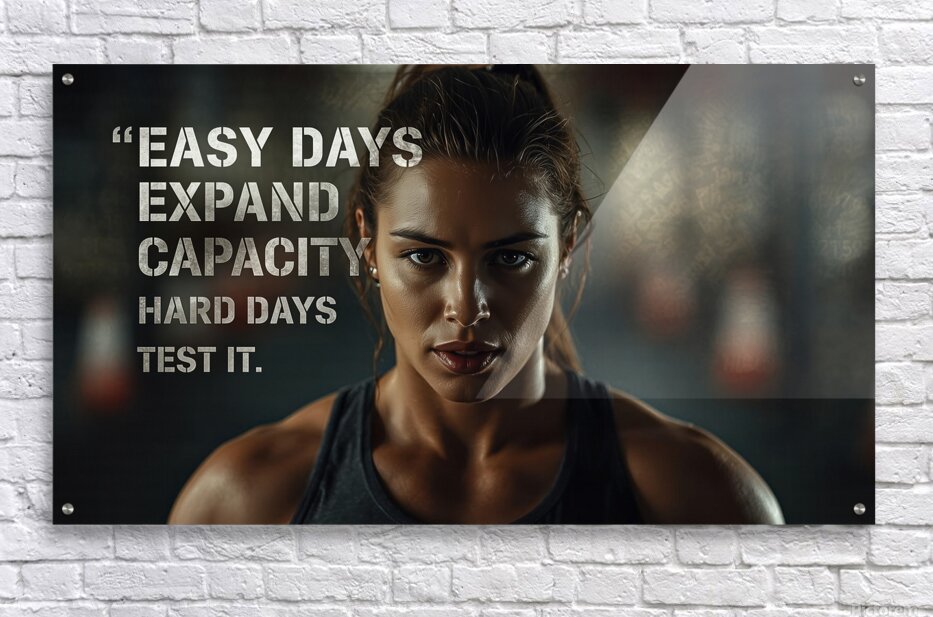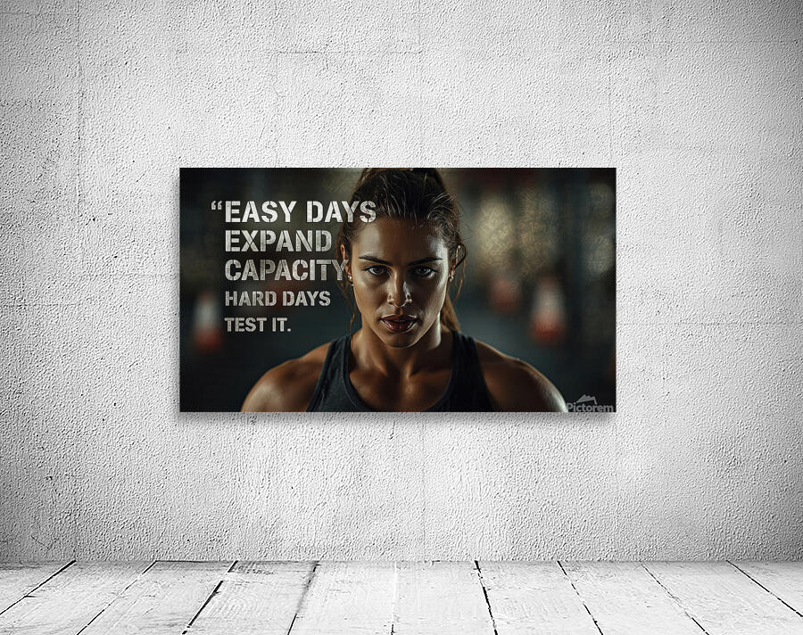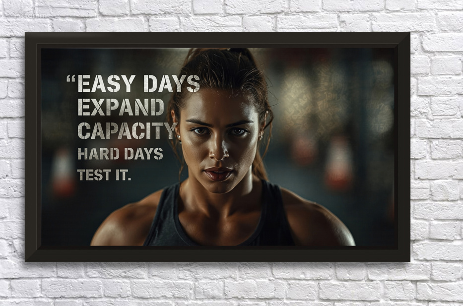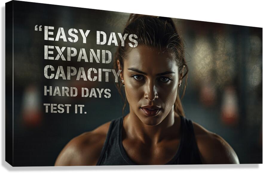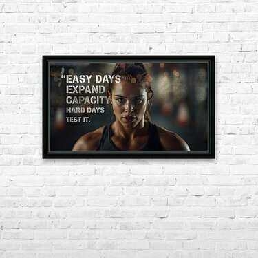 A powerful image of a focused female athlete, sweat glistening under gym lights, paired with the bold quote: “Easy days expand capacity. Hard days test it.” The photo captures grit, resilience, and the mental strength it takes to push past limits. Perfect for gym walls, fitness studios, or motivational spaces, this piece embodies the balance between growth and challenge — a visual anthem for those who rise through both ease and adversity.