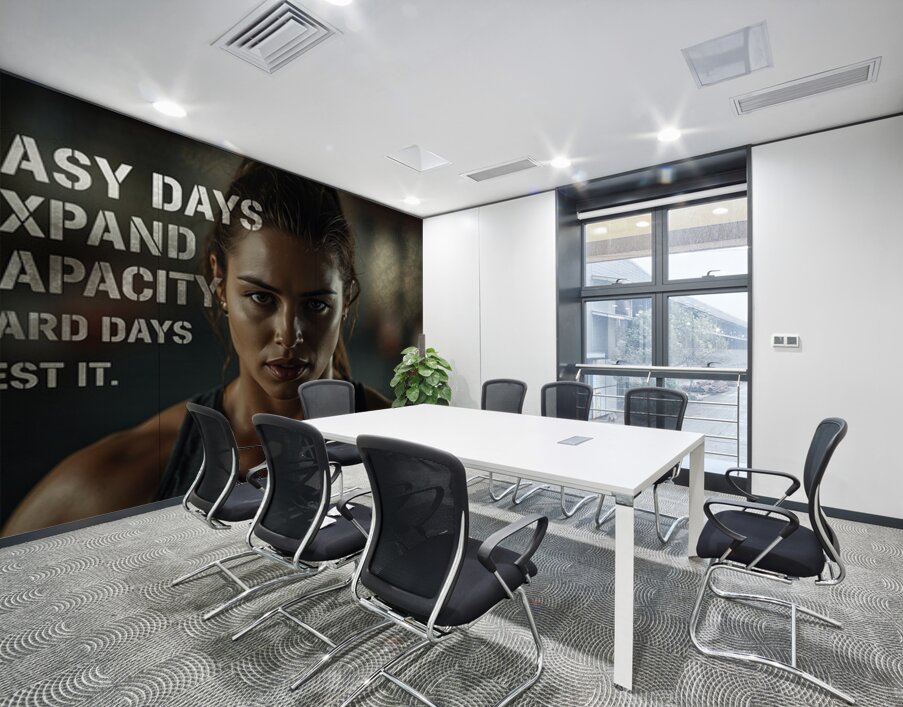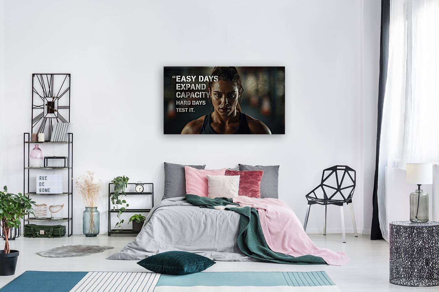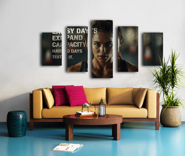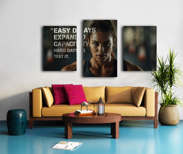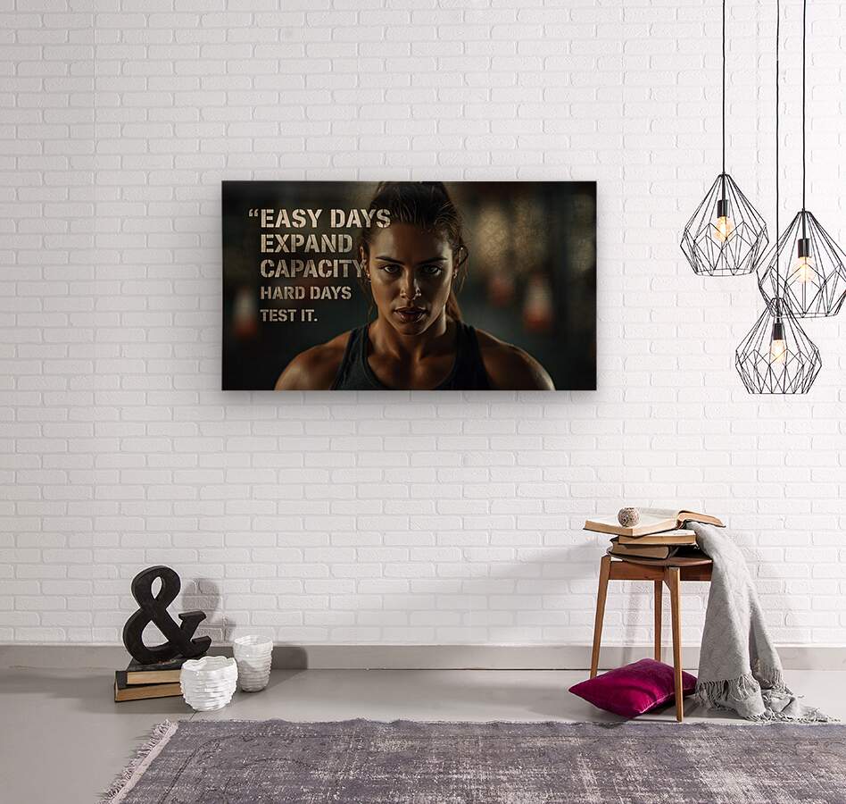 A powerful image of a focused female athlete, sweat glistening under gym lights, paired with the bold quote: “Easy days expand capacity. Hard days test it.” The photo captures grit, resilience, and the mental strength it takes to push past limits. Perfect for gym walls, fitness studios, or motivational spaces, this piece embodies the balance between growth and challenge — a visual anthem for those who rise through both ease and adversity.