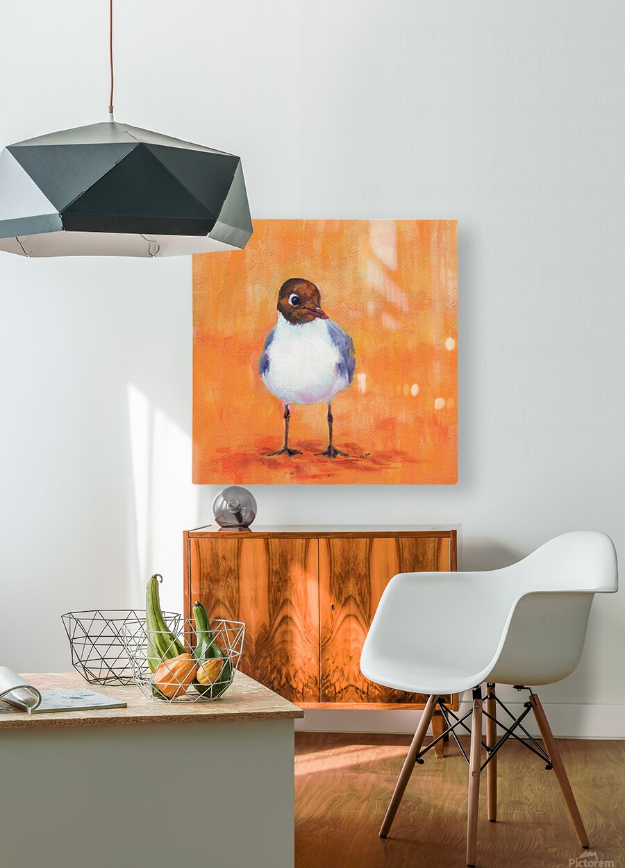 Black-headed Gull on a Sandy Beach is a hand-painted acrylic painting in a contemporary square format by the artist Karen Kaspar. Against an abstract background in various shades of orange sand and yellow a small black-headed gull stands and looks curiously at the viewer. Have you ever tried to have a picnic on a beach? In no time at all you are surrounded by hungry seagulls. The birds move closer and closer and look at the food on offer. Very cheeky animals sometimes manage to snatch snacks from the hands of small children and fly away with them. More paintings with bird motifs can be found in my Collection of Bird paintings. The collection is constantly being expanded. So check it out from time to time. Fine art prints and home decor from original artwork paintings and photography by artist Karen Kaspar. 562