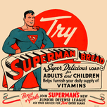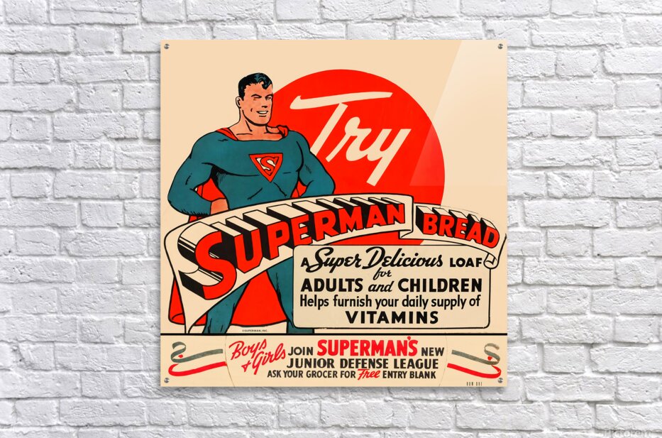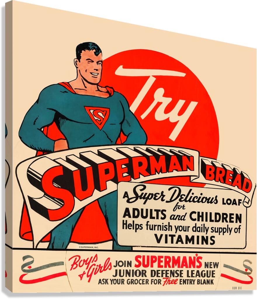 "Try Superman Bread" Vintage Ad Wall Art | Row One | Over 19,000 Historic Art Prints | This unique Superman Bread wall art This 1941 art was copyrighted by Superman, Inc. but the copyright was not renewed.
