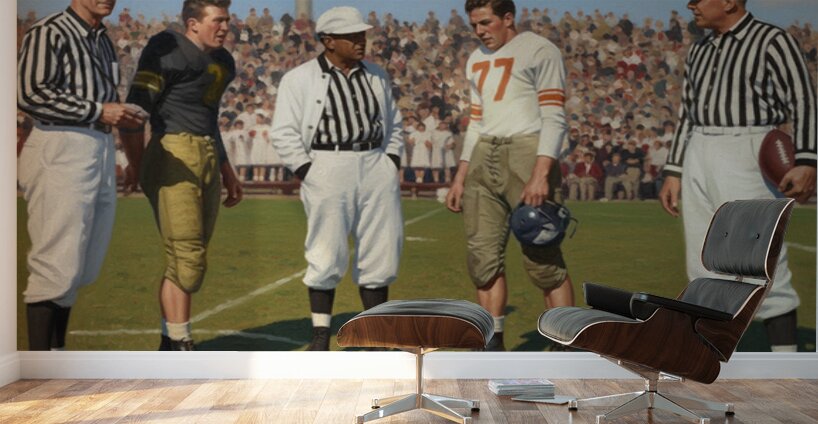 This vintage college football art shows the coin toss of the 1944 Kansas Jayhawks and Missouri Tigers football game played in Kansas City, Missouri. A crowd of 20,000 watched the Tigers beat KU by the score of 28-0 at Blue Stadium in KC. Derivative art © 2025 Row One Brand