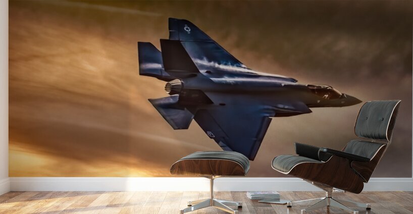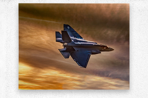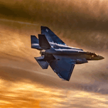 An F-35c Lightning ll accelerates to near-transonic speeds at the Oceana Air Show in Virginia Beach, the pressure changes around its fuselage and wings cause contrails in the humid air to condense. The effect is a magnificent against the orange and yellow sky.