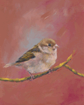 A female sparrow with soft fluffy plumage is sitting on a slender branch. The bird is looking to the right. The delicate feathers of the small bird are painted in various shades of brown with loose gentle brushstrokes. The background is painted abstractly in warm brown purple and earthy tones. Sparrow meeting part one is an acrylic painting in portrait format hand-painted by the artist Karen Kaspar. This painting is part of my mini-series of three paintings - Sparrow Meeting One Two and Three. Each of these paintings shows a female sparrow sitting on a branch. Each of these pictures can be hung on its own. However the three paintings can also be perfectly combined to form a triptych and hung together on a wall for a joint sparrow meeting. Fine art prints and home decor from original artwork paintings and photography by artist Karen Kaspar. 710