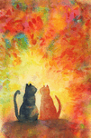 Two cats sit next to each other gazing into a vibrant sunset. The cats are depicted as silhouettes the left cat in darker colors the right cat in shad...[+]