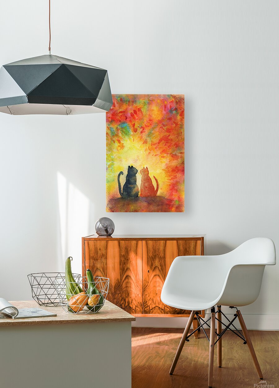 Two cats sit next to each other gazing into a vibrant sunset. The cats are depicted as silhouettes the left cat in darker colors the right cat in shades of red. The two animals are surrounded by a bright explosion of red orange and yellow colours. The colourful autumn leaves illuminated by the autumn sun fall from the trees and bathe the surroundings in warm colours. The scene evokes a feeling of warmth peace and love. Two cats under a colorful sky is a hand-painted watercolor painting in portrait format by the artist Karen Kaspar. More paintings with cat motifs can be found in my Collection of Cat paintings. The album is constantly being expanded. So have a look from time to time. Fine art prints and home decor from original artwork paintings and photography by artist Karen Kaspar. 779