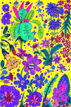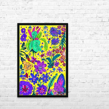 A hand drawn nature inspired design created using coloured ink pens and paper. Features brightly colored flowers and plants fill the frame with a vibr...[+]