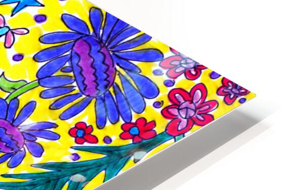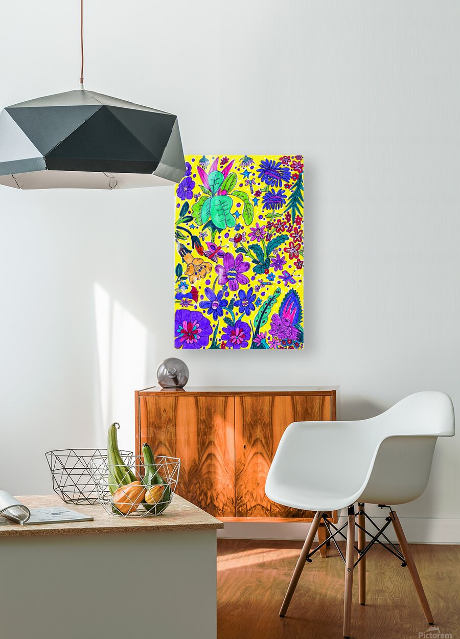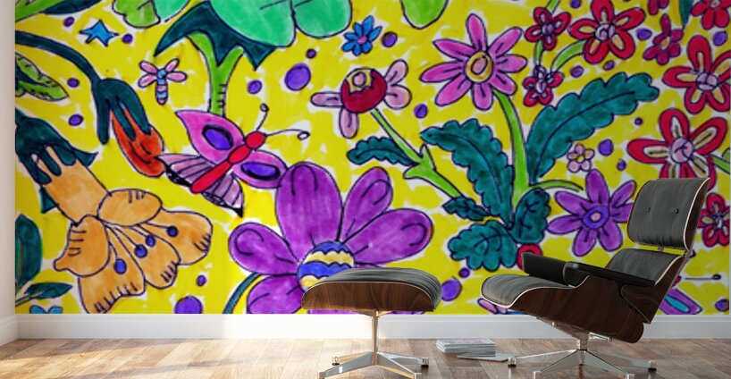 A hand drawn nature inspired design created using coloured ink pens and paper. Features brightly colored flowers and plants fill the frame with a vibrant yellow background. Various shades of purple, blue, red, and green are used to give life to the botanical scene, with some flowers having distinct outlines enhancing their hand drawn qualities.