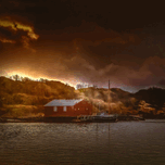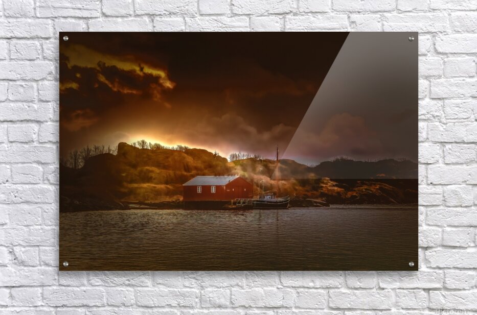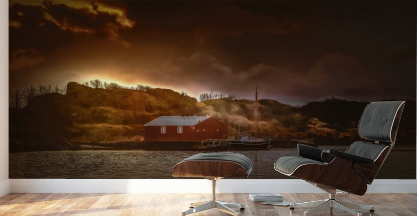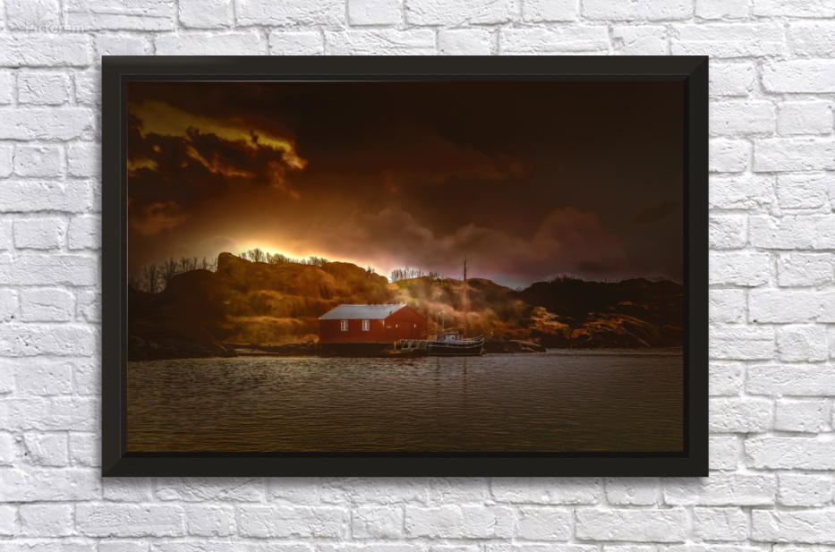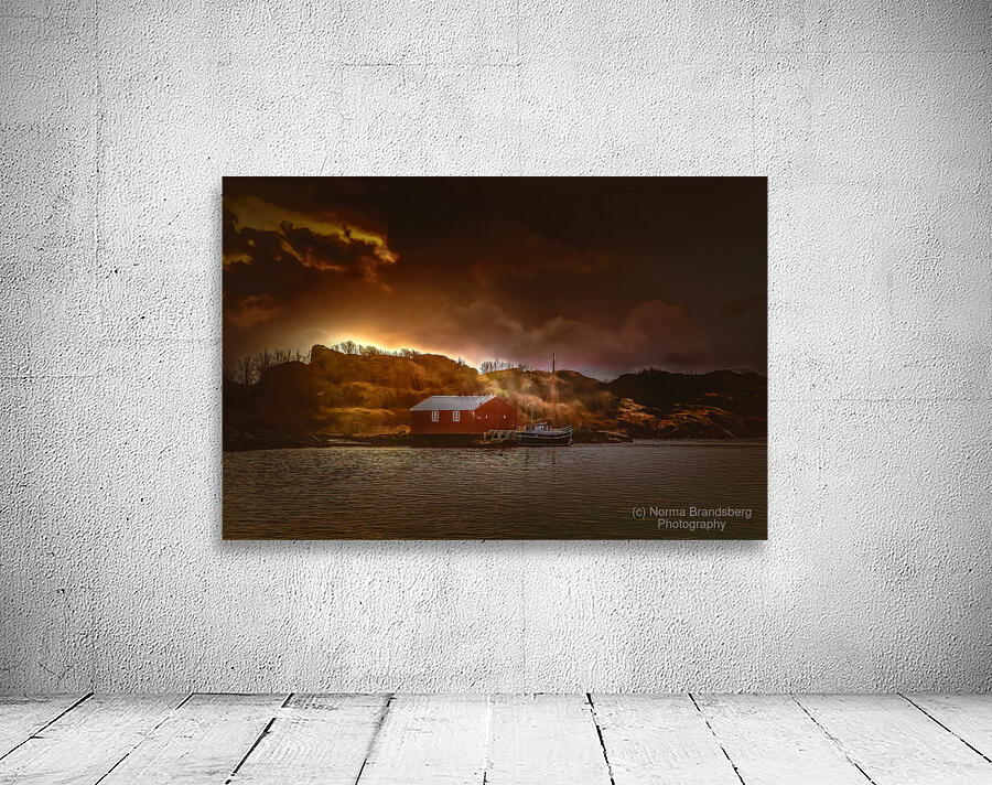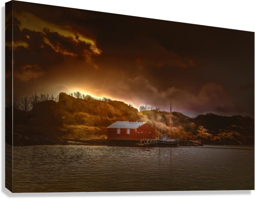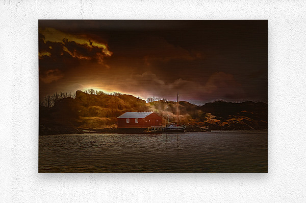The coastal road of Stamsund was serene, the low winter sun casting a warm glow on a typical red boathouse. Inside the quiet harbor, a weathered sailboat sat still, enjoying a moment of January's peace. But the sky told a different story. As golden, rust sunset colored clouds hovered overhead they promised a bruised dark night as the storm-battered sea beyond, clouds rolled in, announcing a vicious gale that was causing havoc for the ferries crossing from mainland Bodo.