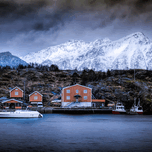 Along the tranquil waters of the charming Norwegian Lofoten Stamsund harbor, vibrant, ochre-colored houses stand at the edge of the water. The dramat...[+]