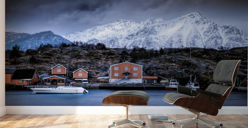 Along the tranquil waters of the charming Norwegian Lofoten Stamsund harbor, vibrant, ochre-colored houses stand at the edge of the water. The dramatic backdrop is formed by snow-covered mountains beneath a dark, atmospheric sky. Despite treacherous conditions caused by gale-force winds and slippery ice, the bright colors of the old buildings provide a striking contrast against the muted tones of the surrounding hills and mountains. Moored boats in the calm harbor contribute to the overall peaceful atmosphere.