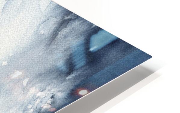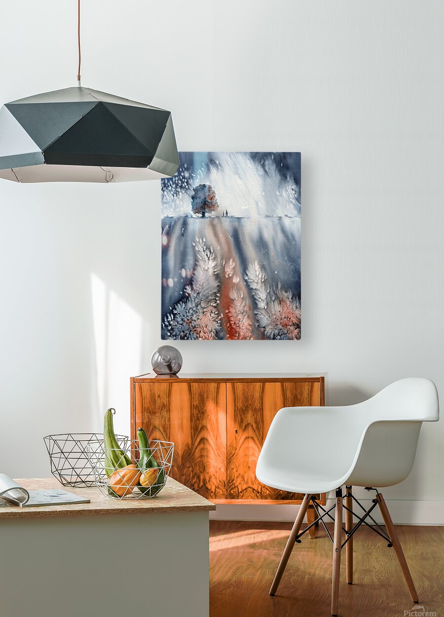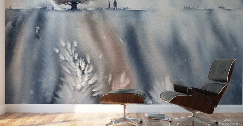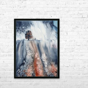 November walk is a watercolor painting in portrait format by the artist Karen Kaspar. It shows an abstracted landscape with a lonely tree and the silhouette of two people walking. The sky is dark and snowflakes dance. The painting is done with only two colours: Indigo blue and sienna brown and the white of the paper. It was a gloomy, cloudy November day when we started our Sunday walk. No one was around, everything was quiet and peaceful as we walked along bare fields and lonely trees. Suddenly, dark clouds rolled in and it began to snow. It was almost like a little blizzard and when we finally reached our car, we looked like little snowmen because we were covered with snow everywhere. This wonderful experience inspired me to paint this abstract landscape painting in watercolors. Fine art prints and home decor from original artwork, paintings and photography by artist Karen Kaspar. 226