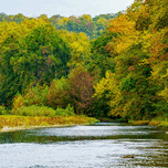 This photograph captures the North Fork River winding gently through the Ozarks near West Plains, Missouri, USA surrounded by colorful autumn foliage....[+]