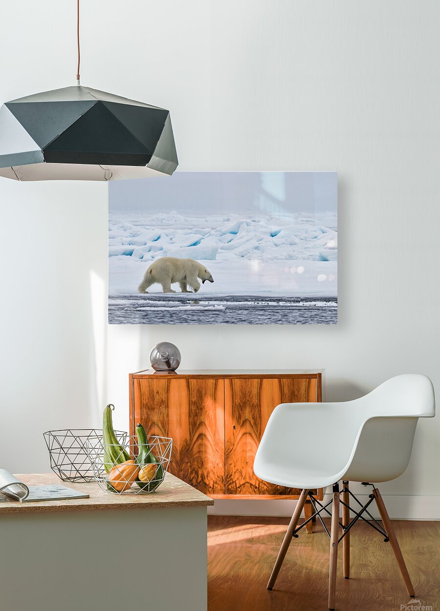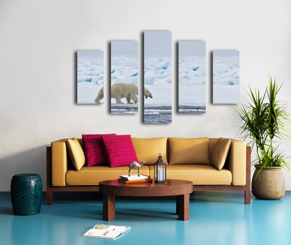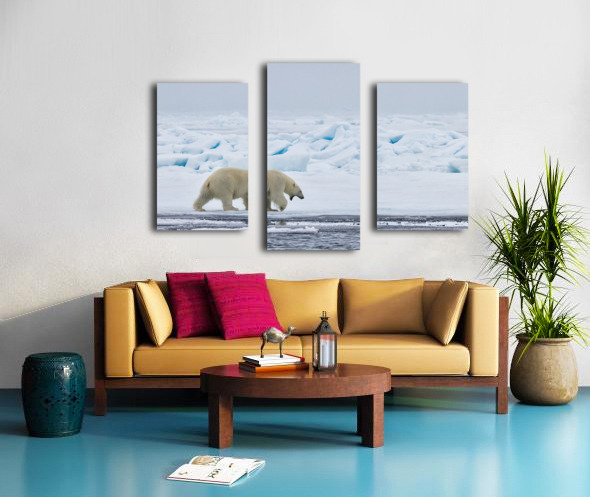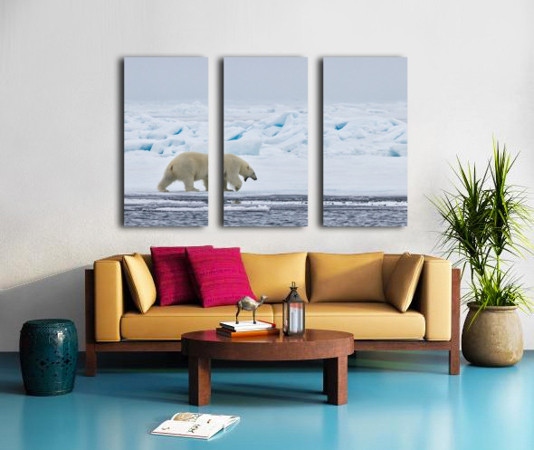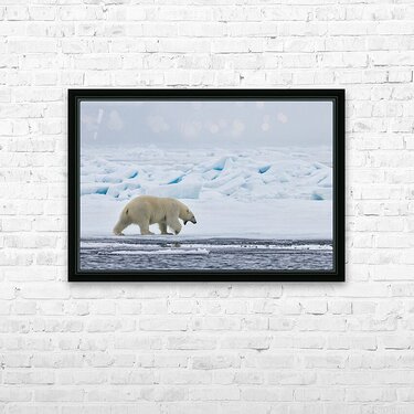 A polar bear rests at the edge of the polar ice cap, surrounded by an expanse of soft white that seems to stretch without a boundary. The scene feels almost weightless. The bear’s calm posture and steady gaze create a gentle focal point in all that openness, giving the image a sense of balance and quiet strength. There’s something soothing about the simplicity here. The empty space isn’t empty at all; it feels like Arctic air, cold light, and the kind of silence you only find far from everything. As a print, it brings a calm, modern look to a room and adds a touch of wild Arctic beauty without overwhelming the space.