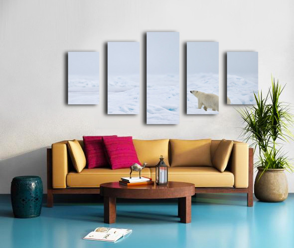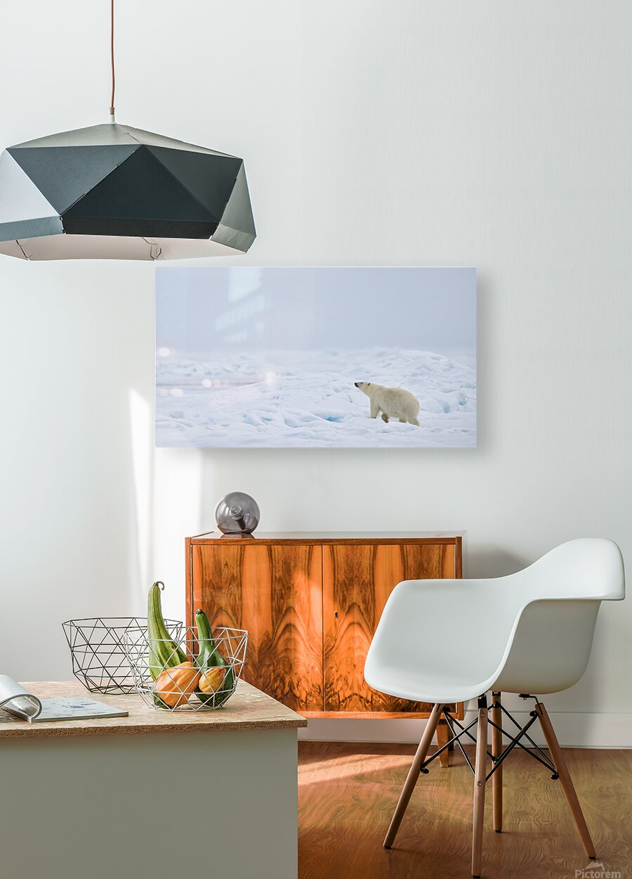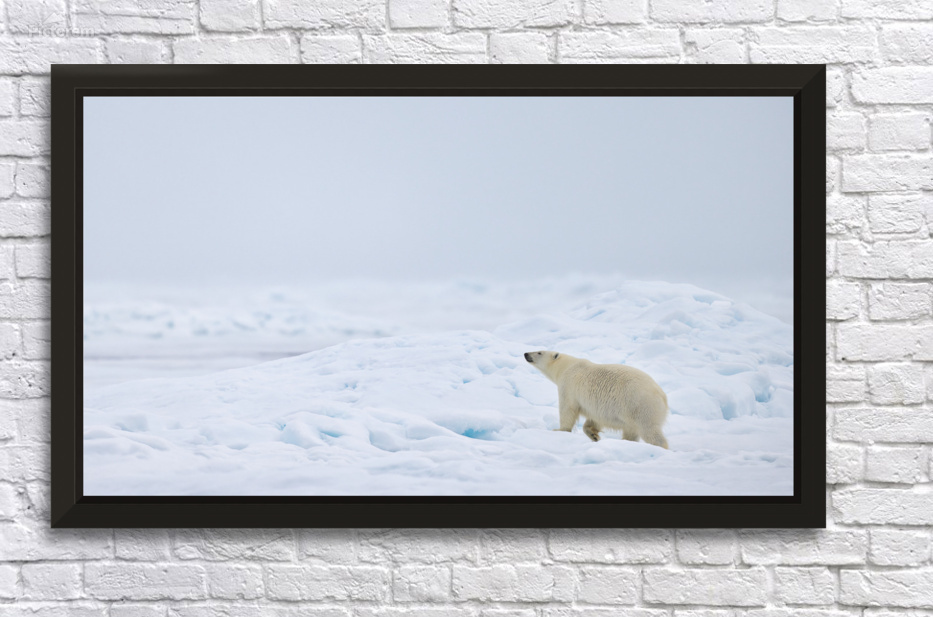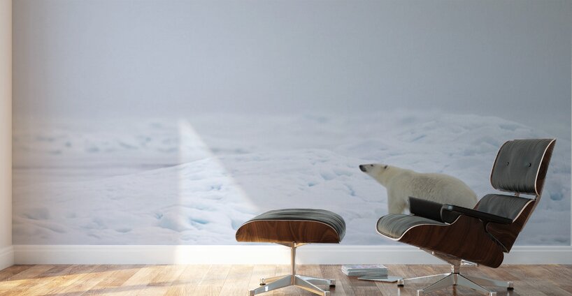 A polar bear rests at the edge of the polar ice cap, surrounded by an expanse of soft white that seems to stretch without a boundary. The scene feels almost weightless. The bear’s calm posture and steady gaze create a gentle focal point in all that openness, giving the image a sense of balance and quiet strength. There’s something soothing about the simplicity here. The empty space isn’t empty at all; it feels like Arctic air, cold light, and the kind of silence you only find far from everything. As a print, it brings a calm, modern look to a room and adds a touch of wild Arctic beauty without overwhelming the space.
