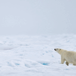 A polar bear rests at the edge of the polar ice cap, surrounded by an expanse of soft white that seems to stretch without a boundary. The scene feels ...[+]