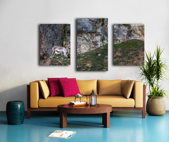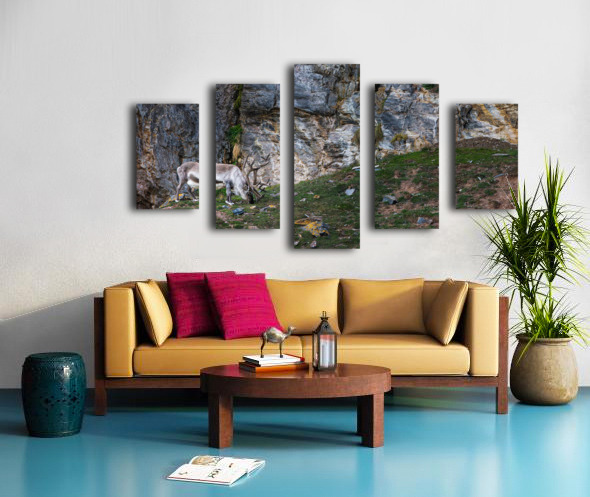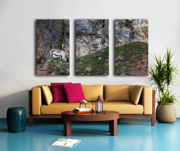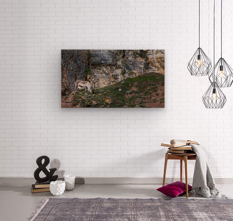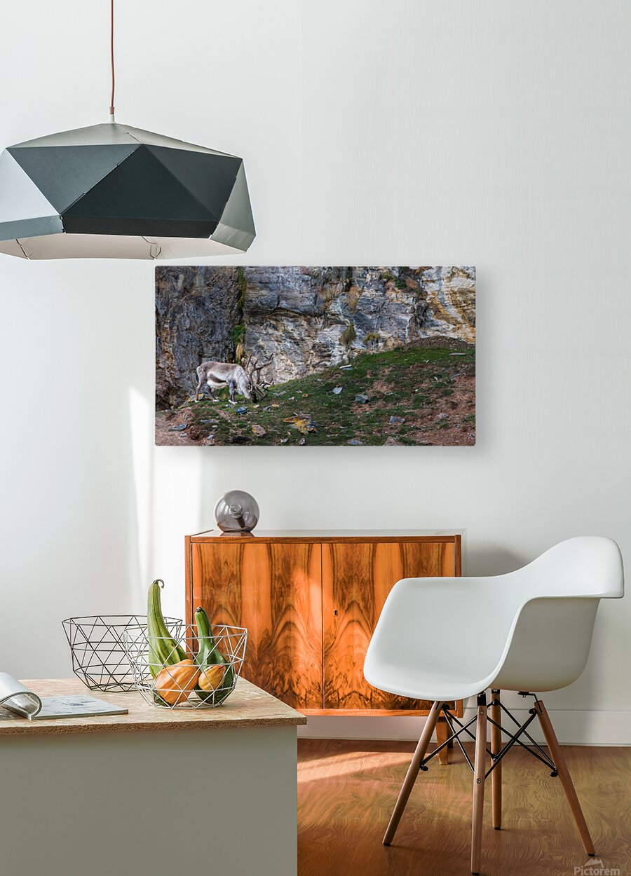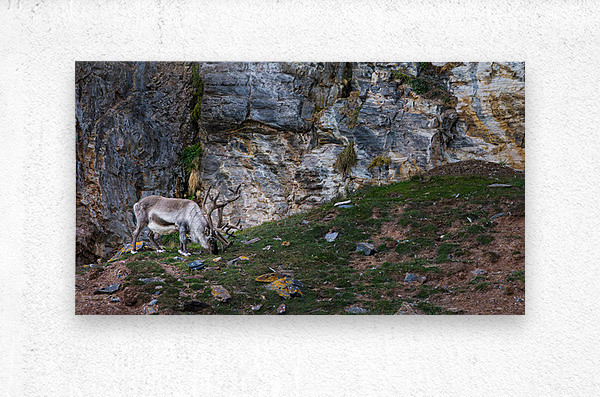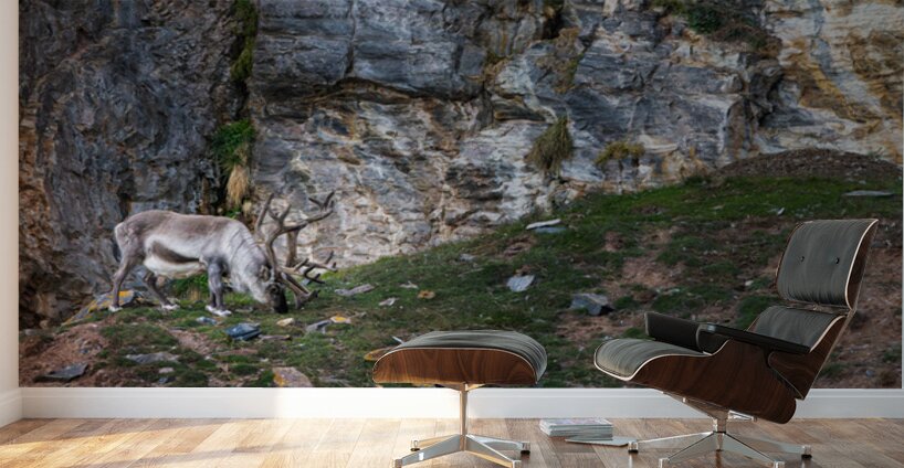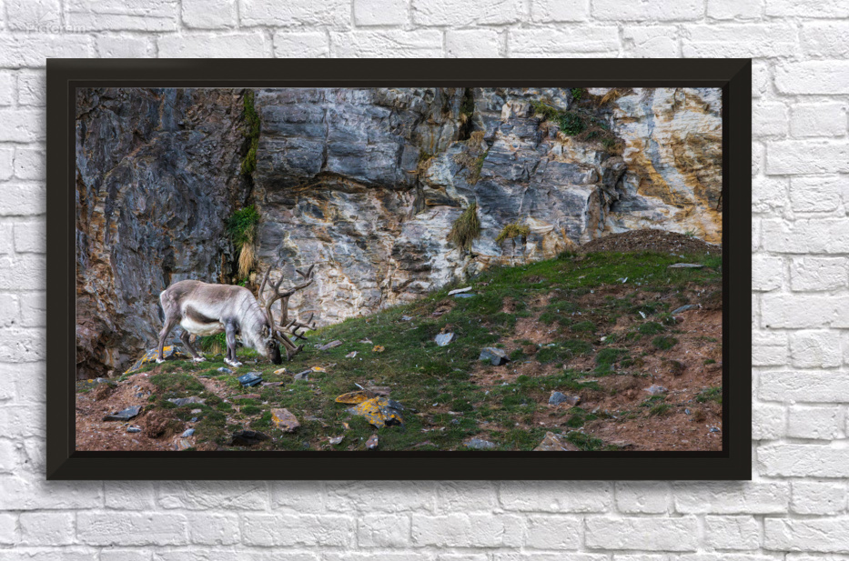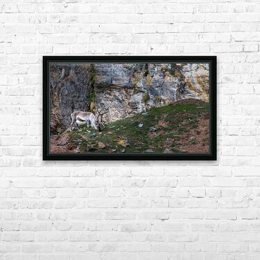 A lone reindeer grazes quietly at the base of a weathered cliff, its antlers curling like old roots against the stone. The rough rock face rises behind it in layers of slate, gold, and ash, forming a dramatic backdrop that feels ancient and untouched. Soft Arctic light sweeps across the scene, catching the texture of the fur, the lichen on scattered stones, and the small patches of green pushing through the tundra. The result is calm, rugged, and deeply atmospheric. It has that feeling of standing somewhere far from everything, watching a wild animal move through its world without haste. This is the kind of piece that brings a sense of stillness and raw northern beauty into a room, the kind of print people pause for because it feels real.