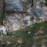 A lone reindeer grazes quietly at the base of a weathered cliff, its antlers curling like old roots against the stone. The rough rock face rises behin...[+]