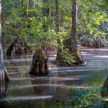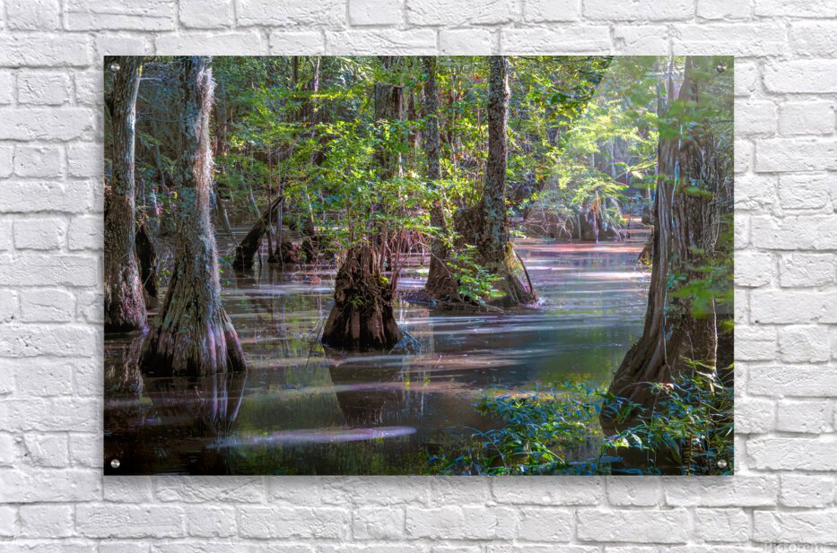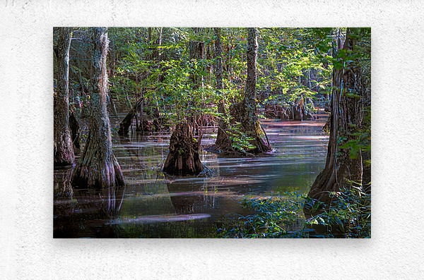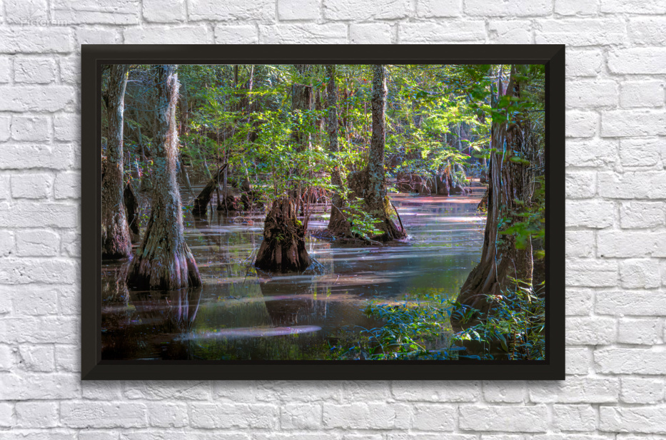 At sunrise, the Bald Cypress Tree rainbow swamp awakens as a vision of pure enchantment, a secret shared between the heavens and the earth. As the first, tender rays of sunlight kiss the water's surface, a breathtaking prismatic dance of color unfolds across the still, dark black pools of swamp water. This majestic Bald Cypress Trees magical landscape, with their gnarled, mysterious "knees" emerging from the water, stand as silent sentinels to this magical moment. The rainbow effect results from leaf decay in the swamp during fall and winter creating an oil on the water surface, making a perfect medium to reflect colors at sunrise and sunset.