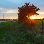 A brilliant sunburst glows above the horizon, perfectly framed by the vibrant red foliage of a sumac tree along a barbed wire fence on a quiet Missour...[+]
