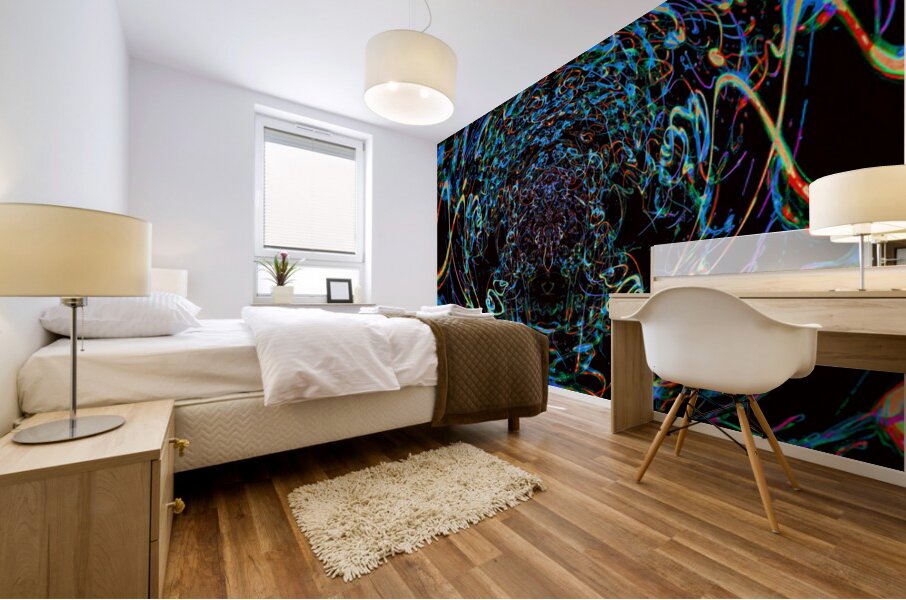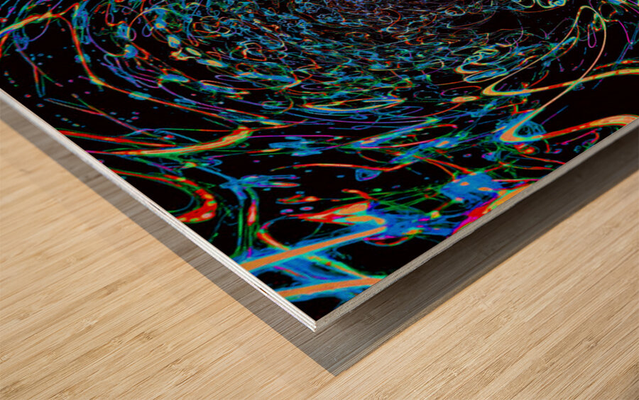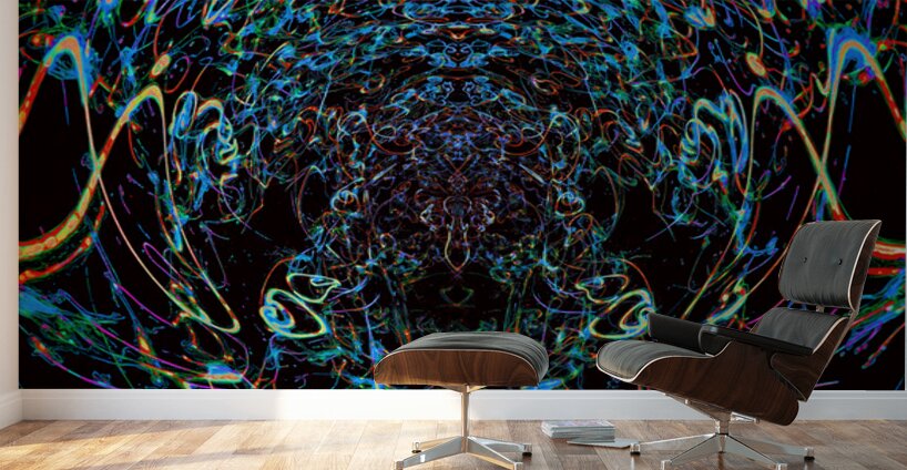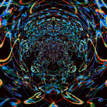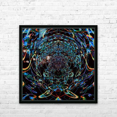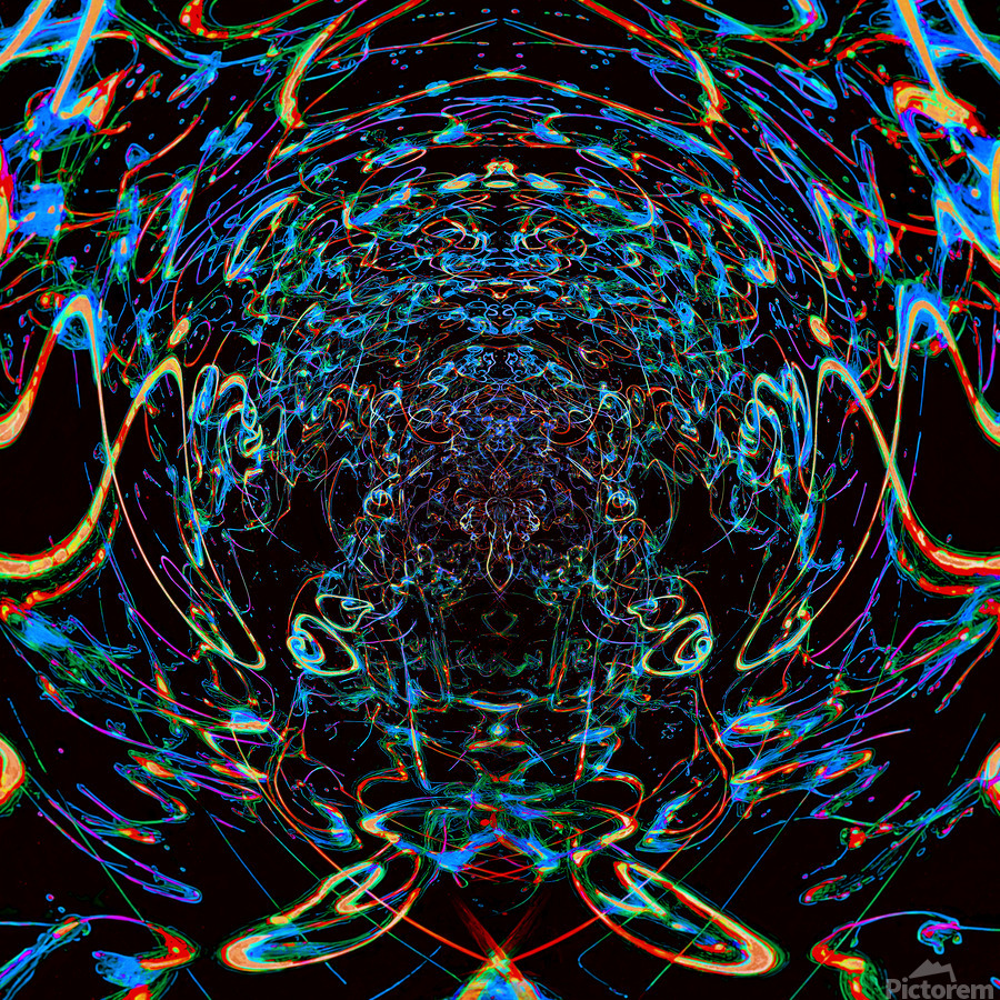 The piece engulfs the viewer in a swirling vortex of vibrant, neon-like lines and organic splatters against an abyss-like black background. Dominant b...[+]