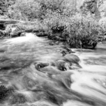 This black and white long exposure photograph captures the powerful flow of Greer Spring near Alton, Missouri, USA, surrounded by a wooded scene in th...[+]