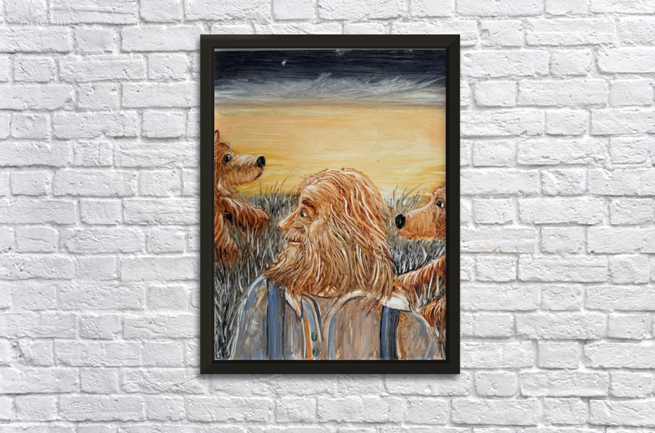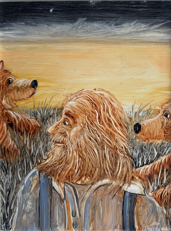 Two cub bears and old farmer in a field . Oil painting by Les Smith