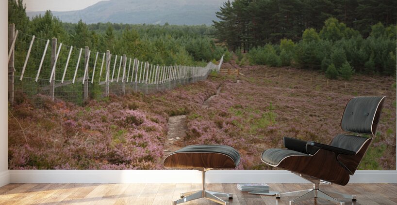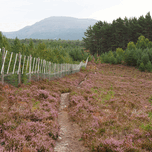 I took this photo during a lovely summer nature walk through the Scottish Highlands. Features a narrow single track winding through a field of purple heather, bordered by a fence and leading towards Pine trees. In the background, a mountain watches under a subtle sky.