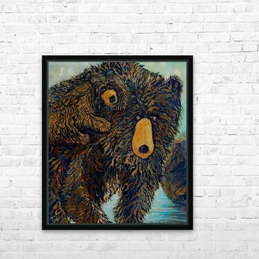 Grizzly bear and her cub, original oil painting by Les