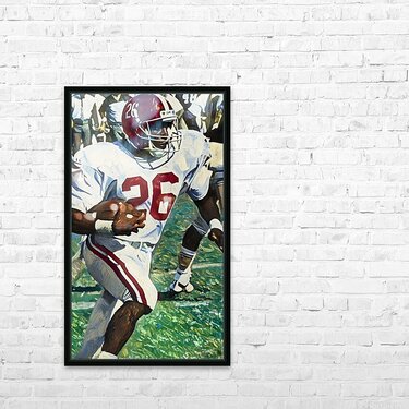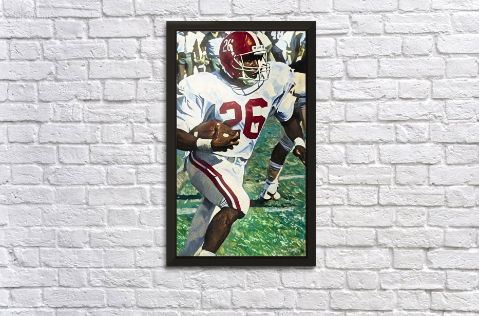 Alabama star running back Bobby Humphrey flies down the field in this Row One Brand retro Alabama Crimson Tide football art, a mixed media painting. D...[+]