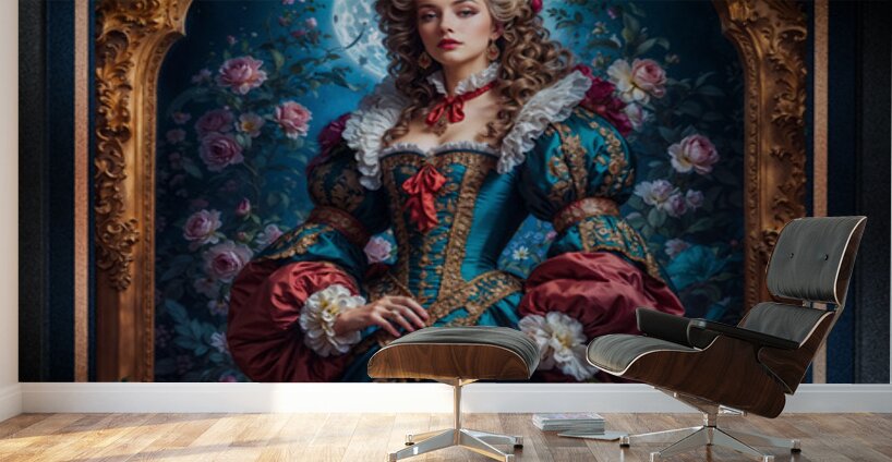 Baroque Portrait Of Lady Drusella Volkovinna AI Concept Art by Xzendor7; is a stunning work of art that transports viewers to an era of opulent beauty and whimsical fantasy, showcasing a captivating female figure within a lavishly detailed environment of floral blooms. The portrait skillfully blends elements of 18th-century courtly portraiture with imaginative flourishes, creating a visual feast for the eyes that is both aesthetically pleasing and deeply engaging. Lady Drusella's elegant attire, intricate hairstyle, and serene expression are complemented by a backdrop of lush flowers and a moonlit sky; resulting in an artwork that evokes feelings of wonder and admiration. Read The Story At: https://xzendor7.com/baroque-portrait-of-lady-drusella-volkovinna/