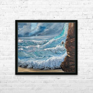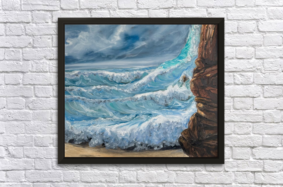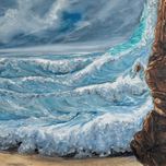 .Beautiful, colorful, seascape, breaking onshore against a big rock. Oil painting by les smith