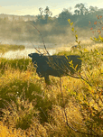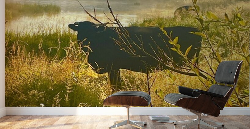 Black cow Silhouetteat at sunrise. Bright morning sun is up. Cows are grazing around the pond where they could find some good green grass. Photograph by les smith
