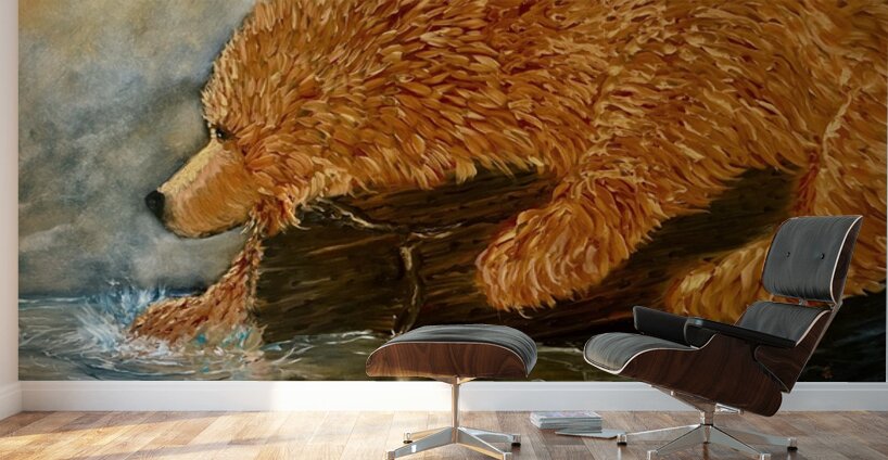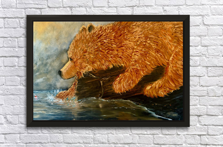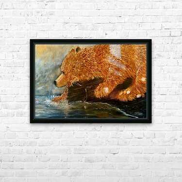 Grizzly waiting for the fishing bobber to move oil painting on wood . Grizzly bears trying to find a better way to fish. Original oil painting by les ...[+]