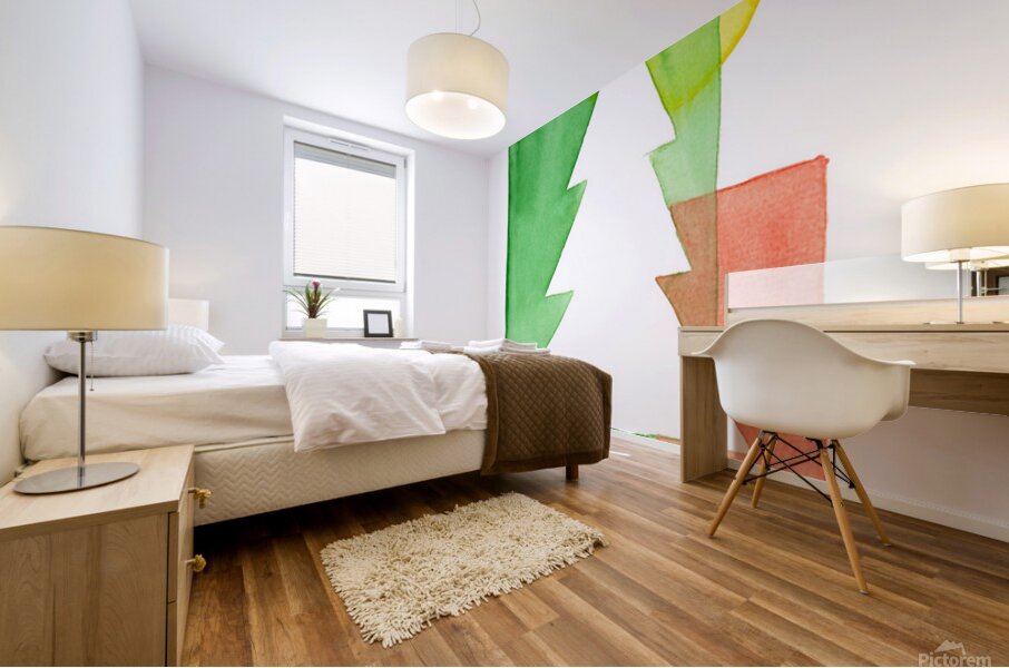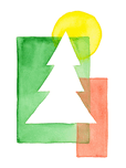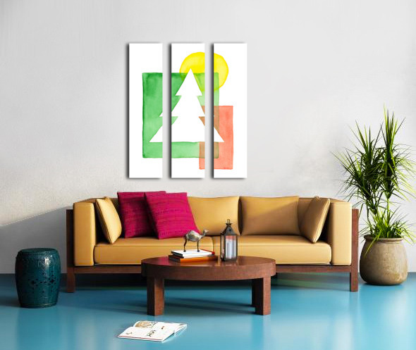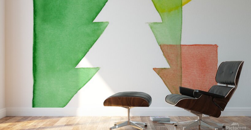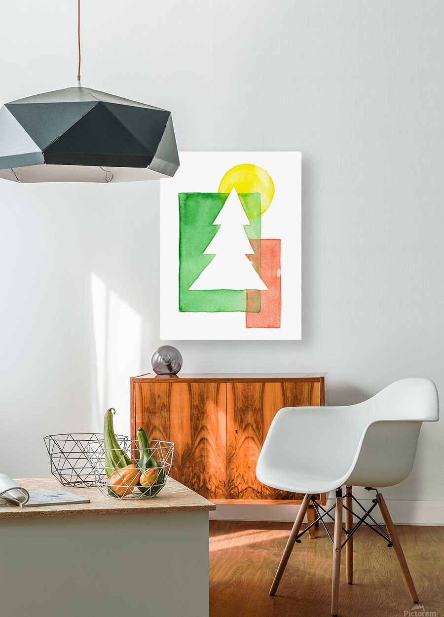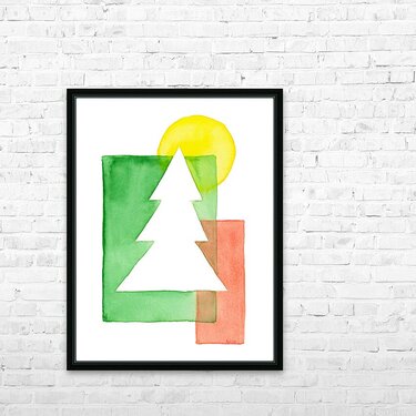 The watercolor painting shows a minimalist composition of overlapping geometric shapes in shades of red, green and yellow. A white Christmas tree is p...[+]