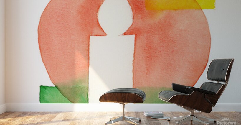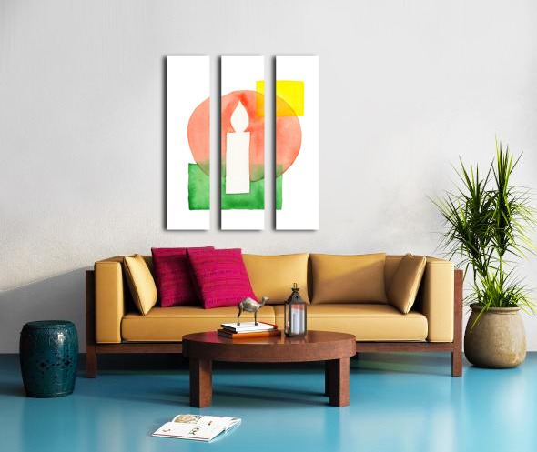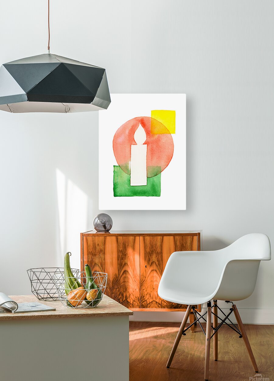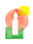 The watercolor painting shows a minimalist composition of overlapping geometric shapes in shades of red, green and yellow. A white candle is placed pr...[+]