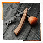Ce cadre présente un rasoir droit au manche en bois rayé, accompagné d'un pinceau à barbe orangé, reposant sur une surface en bois sombre. Le...[+]