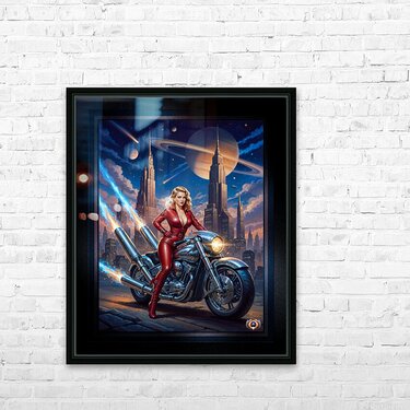 Get this artwork "Urra Tyrlan Riding Her Deblenus Cr93721 Power Bike Portrait Gorgeous AI Concept Art by Xzendor7" in a framed print.