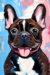 A captivating and joyful portrait of a brindle French Bulldog, rendered in a bold, expressive style. This artwork features a smiling Frenchie with bright blue eyes and a tongue out, set against a lively, colorful background of striking blues and pinks. The rich textures and dynamic brushwork bring the lovable personality of this popular breed to life. Perfect for dog lovers and fans of contemporary animal art, this piece makes a wonderful addition to any collection, offering a burst of color and happiness to any product or space.