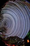 This long-exposure image reveals the night sky turning around a fixed point, with thousands of star trails forming tight, concentric circles across th...[+]