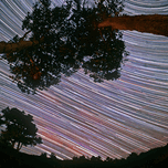This long-exposure image reveals the night sky in motion as sweeping star trails arc across the frame, tracing Earth’s rotation over many hours. Framed by the silhouetted branches and canopy of a towering tree, the celestial paths flow behind the natural foreground, blending cool whites and blues with subtle warm tones near the horizon. The composition unites the stillness of the landscape with the constant movement of the stars, offering a grounded perspective on the passage of time beneath the night sky.