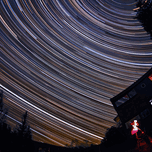This long-exposure image captures the apparent rotation of the night sky as dense arcs of starlight sweeping overhead. Thousands of individual stellar paths blend into continuous trails, revealing the steady motion imposed by Earth’s rotation. Framed by silhouetted trees and a softly illuminated structure, the scene contrasts human stillness with the vast, clockwork movement of the cosmos, turning time itself into a visible element of the night.
