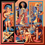 The canvas reads like a room divided into three secrets each framed and lit by the same strange sun. Colors argue and harmonize — coral and saffron pushing against cool ultramarine skin tones carved from peaches and clay. Black lines hold everything in place like the ribs of a story that is both precise and playful. On the left panel a woman sits like the opening paragraph of a letter. Her posture is confident and slightly theatrical: one knee up the other bent a drape of fabric that could be a robe or a wave. Her face is stylized hair a sculpted helmet of blue. Around her float a few intimate objects — a saucer a cone a small bowl — each rendered with the same solemn geometry. The space around her is intimate and staged as if she’s performed this pose every morning for years a ritual posed between thought and action. A crescent shape curves near her a whispering moon that balances the heavier blocks of color beneath her feet. The central panel is a fever dream of apparatus and ambition. A taller more statuesque figure dominates the middle striding forward in a dress whose pattern is itself a language of teardrops and petals. She is the alchemist of the composition: on her left a delicate scale hangs on her right a column of vessels and retorts rises like a city of experiments. Bowls overflow with spheres that could be fruit planets or ideas slender legs and arms interweave with pipes and pedestals. Tiny human figures reappear scaled down to serve as witnesses or assistants climbing ladders and balancing on spindles. Light pools down like a spotlight carving shadows that make every object read as an invitation or an instruction. The motion here is forward improvisational: the central woman is mid-step mid-thought as if she might rearrange the laws of her world with a single movement. On the right the composition tightens into a cabinet of curiosities. A figure more angular almost architectural presides over stacked bowls truncated columns and bulbous forms that echo the earlier motifs. There’s a sense of counting and collecting here — bowls nested inside bowls spheres held in concave hands a cadence of repetition that feels like inventorying a life. The shapes are playful yet purposeful: a tall spindle a hemisphere balanced on a column a vertical rectangle that might be a mirror a ledger or a door. The rightmost edge of the canvas suggests a boundary — an exit or an archive where the day’s experiments are stowed away. Across all three panels elements repeat and answer one another. Spheres roll from one frame to the next a curved line draws the eye in a slow S leading from the seated figure through the laboratory of the central panel to the quiet archive. The same palette keeps the chapters in conversation: warm oranges and cool blues move like characters that speak different dialects but share a hometown. What haunts the image is its tenderness toward the mechanical. Juxtapositions of flesh and instrument — a leg that ends in a pedestal a hand resting on a bowl like a librarian’s stamp — give the scene a human warmth even as it celebrates structure and order. It feels like a snapshot from a world where people make narratives out of geometry: lives arranged as experiments memories cataloged in rounded vessels identity assembled from pattern and policy. There is no single resolution here. Instead the triptych offers the pleasure of watching a houseful of small intentional acts: a movement begun an experiment midair an inventory quietly completed. The viewer becomes a sneaking witness following the little orbs and the longer shadows turning each framed scene like a page. The final sensation is one of curiosity — a promise that if you step closer you will find more small mechanisms more quiet rituals and perhaps a secret tucked into one of the bowls waiting to be tipped into the center of the story.