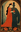 An arch of burnished gold frames them like the opening of a secret theater. Beyond it a muted garden leans close—stylized stems and flowers rising in careful rows as if the whole scene were planted on a stage and watered with deliberate light. The palette is spare and persuasive: warm ochres and deep crimsons pressed against a velvety black-green each hue chosen to make the other burn brighter. She is a flame in cut silk. Her gown flows down in a single inevitable cascade of red the fabric folding and sweeping like a tide around her ankles. Long black hair falls past her shoulder in a smooth slow river her profile is serene and intent head tilted slightly forward as if she will whisper or decode a secret. A tiny bright ornament rests in her hair and a simple necklace catches the light against her throat. Her hands are the actors here—delicate decisive—cupping a perfect orange-red sphere with a reverence that makes the object feel like a vow. He is the shadow that balances her light. Clad in loose dark robes that swallow the contours of his body he stands calm and unadorned except for a heavy rosary of beads at his chest and a dark tall hat that gives him an archetypal dignity. His skin is rendered in a deep dusky tone that makes his face almost sculptural against the pale oval behind them. With one hand he offers a small bowl held low and steady with the other he receives the orb or perhaps passes it—there is an exchange that feels ritualistic rather than casual. Around their feet stylized poppies and blooming motifs take on the role of witnesses. The flowers are large and formal their petals echoing the curve of the arch the curve of her sleeves the roundness of the sphere—repetition as a kind of silent chorus. The decorative border frames them like a reliquary its patterns of leaves and scrolls drawing the eye inward and insisting that this moment be seen as more than a portrait: it is a transaction a promise a pact in miniature. There is tension in the hush. Who gives who takes? Is the sphere a fruit an offering a secret heart? Their faces keep their stories to themselves: she intent and luminous he composed and enigmatic. The scene lingers like the last page of a chapter—everything poised on a single deliberate gesture—inviting you to imagine what comes after the exchange to turn the page and follow them into the garden’s twilight.