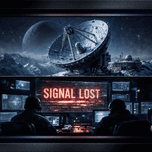 This evocative split-scene artwork portrays a colossal radio telescope atop snow-laden mountains beneath an expansive star-filled sky, its metallic surface reflecting celestial light. Below, two operators in silhouette oversee a command center flooded with glowing blue data screens and a central display screaming “SIGNAL LOST” in pulsating red text. The atmosphere is one of silent tension—humanity’s reach into the cosmos suddenly severed. Rendered in hyperrealistic digital art style, it combines cinematic composition with meticulous detail: snow textures, metallic sheens, control console interfaces. The scene conveys isolation and dread without violence or overt alien presence. It's a powerful meditation on communication failure in deep space exploration. Read More At: https://xzendor7.com/contact-has-been-lost-victor-sarkens-transmission/