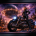 Livia Rorino, a warrior rider in sleek black leather and brass-plated armor, commands the *Furia Ignis*—a powerful industrial motorcycle with glowing blue exhausts—in a devastated cityscape. The ruins of gothic architecture burn under the glow of an immense space station orbiting above. Her presence is stoic yet commanding as she stands beside her machine, eyes fixed on the cosmos. The artwork features hyper-realistic textures: every rivet, crease in leather, and reflection on chrome is meticulously rendered. Deep cinematic lighting creates dramatic contrast between shadows and radiant starlight, while distant fires add warmth to the cool purple sky. This dark fantasy masterpiece blends science fiction with gothic elements for a visually stunning narrative of survival and defiance against cosmic entropy. Read More At: https://xzendor7.com/galactic-portrait-livia-rorino-amidst-wasteland/