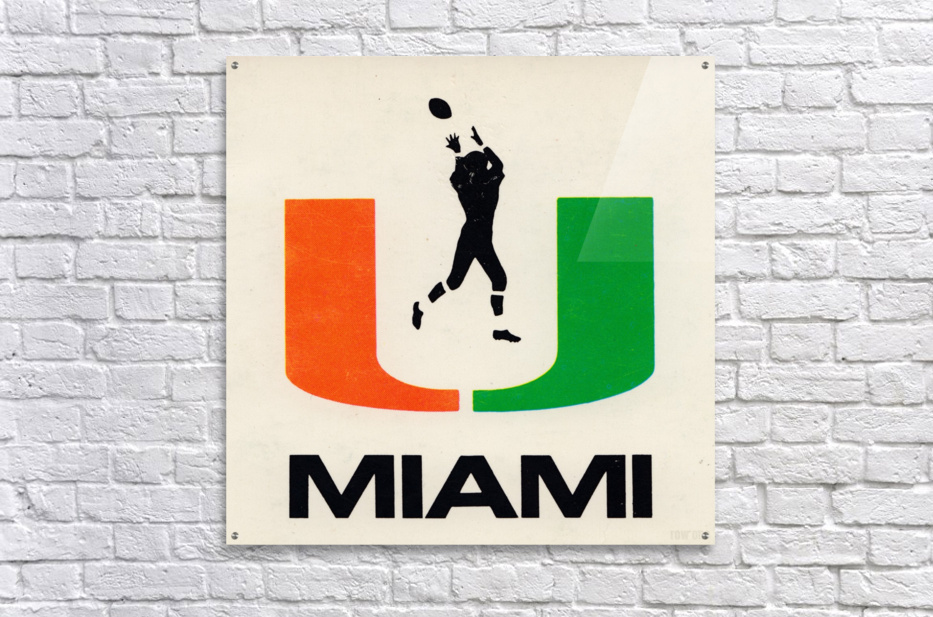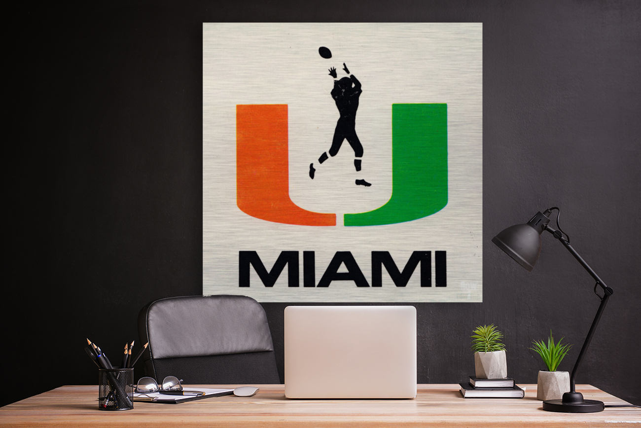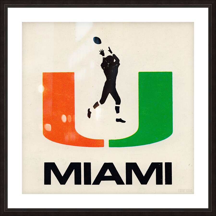 1974 Miami Hurricanes Football Art | Row One | Over 15,000 Historic Sports Prints | This authentic '74 Miami football art reproduction art will look fantastic in your game room or office. Row One Brand's historic sports art prints are not affiliated with, licensed, sponsored, authorized, or endorsed by any college, university, pro team, league, artist, athlete, venue, or any licensing entity. This art was created from a memorabilia design was published in 1974 without a copyright notice.